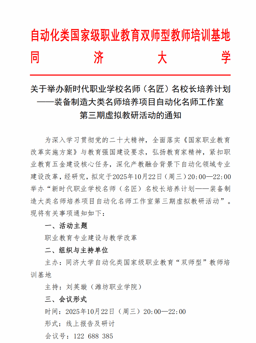 2025年10月22日晚,学校第三批国家级职业教育教师创新团队全体成员、殷欢名师工作室全体成员、电气工程全体教师、学校对口帮扶江西枫林涉外经贸职业学院及江西洪州职业学院相关二级学院教师共同参与了装备制造大类名师培养项目自动化名师工作室第三期虚拟教研活动。