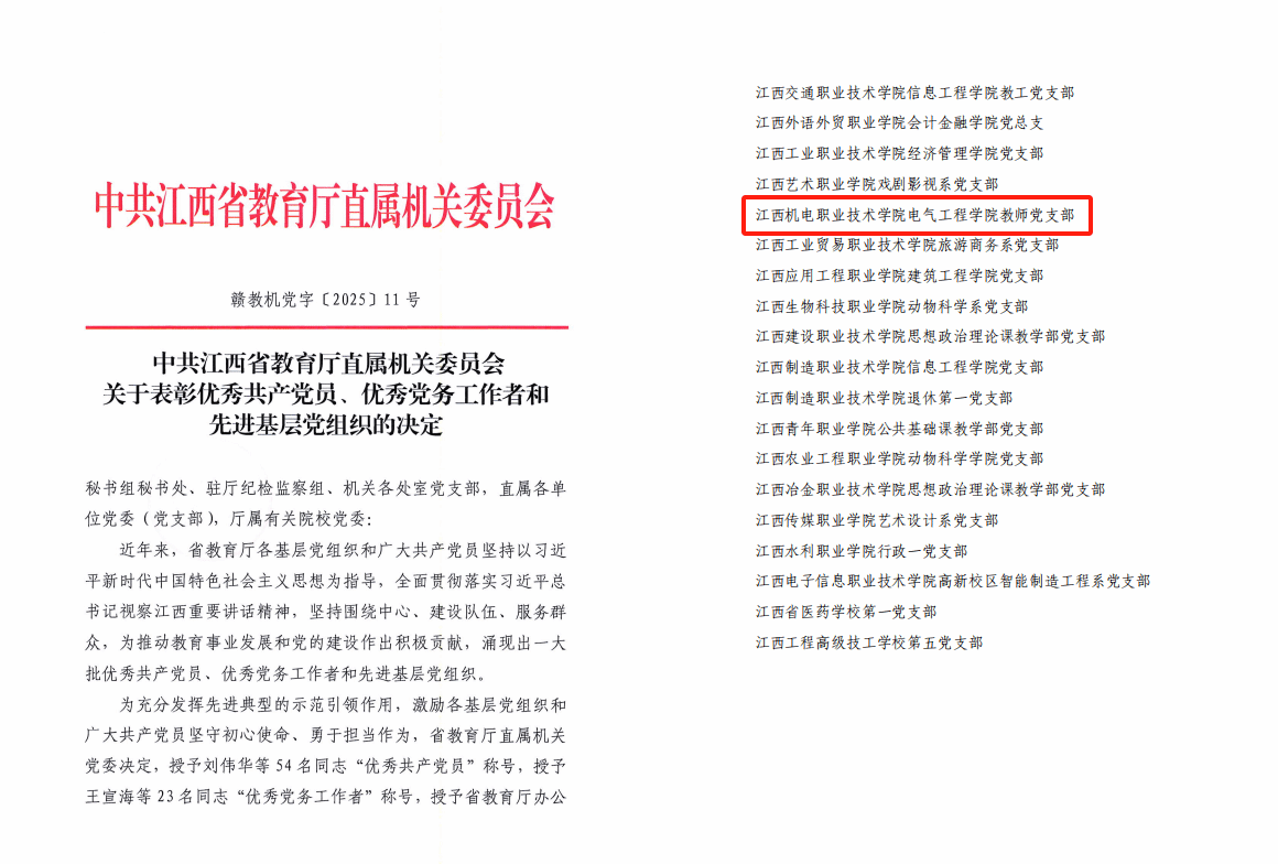 2025年7月1日,在庆祝中国共产党成立104周年之际,中共江西省教育厅直属机关委员会发布表彰决定,江西机电职业技术学院电气工程学院教师党支部凭借在党建引领职业教育高质量发展中的突出表现,荣获“先进基层党组织”称号。这一荣誉既是对该支部多年来深耕职教一线、创新党建模式的肯定,也为全校院系基层党组织建设树立了标杆。