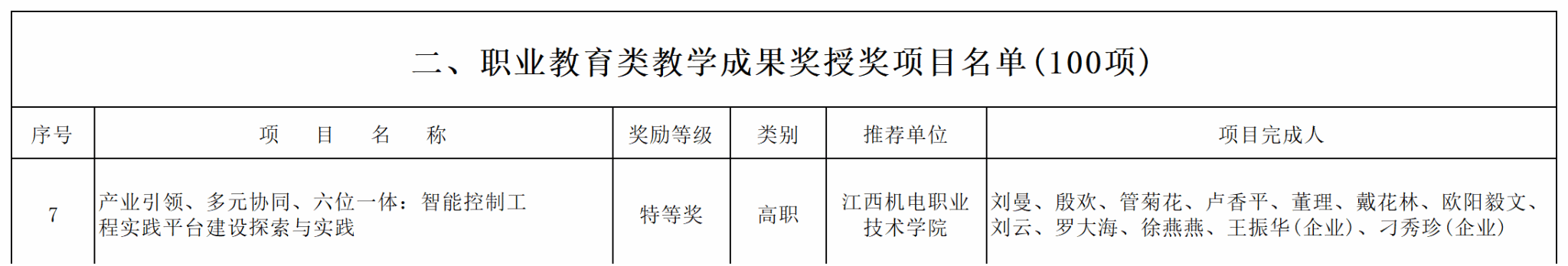 近日,江西省人民政府公布了2022年省级教学成果奖评选结果(赣府字〔2023〕88号),我校取得新突破,由殷欢“双师型”名师工作室核心成员刘曼教授牵头主持的《产业引领、多元协同、六位一体:智能控制工程实践平台建设探索与实践》荣获特等奖。