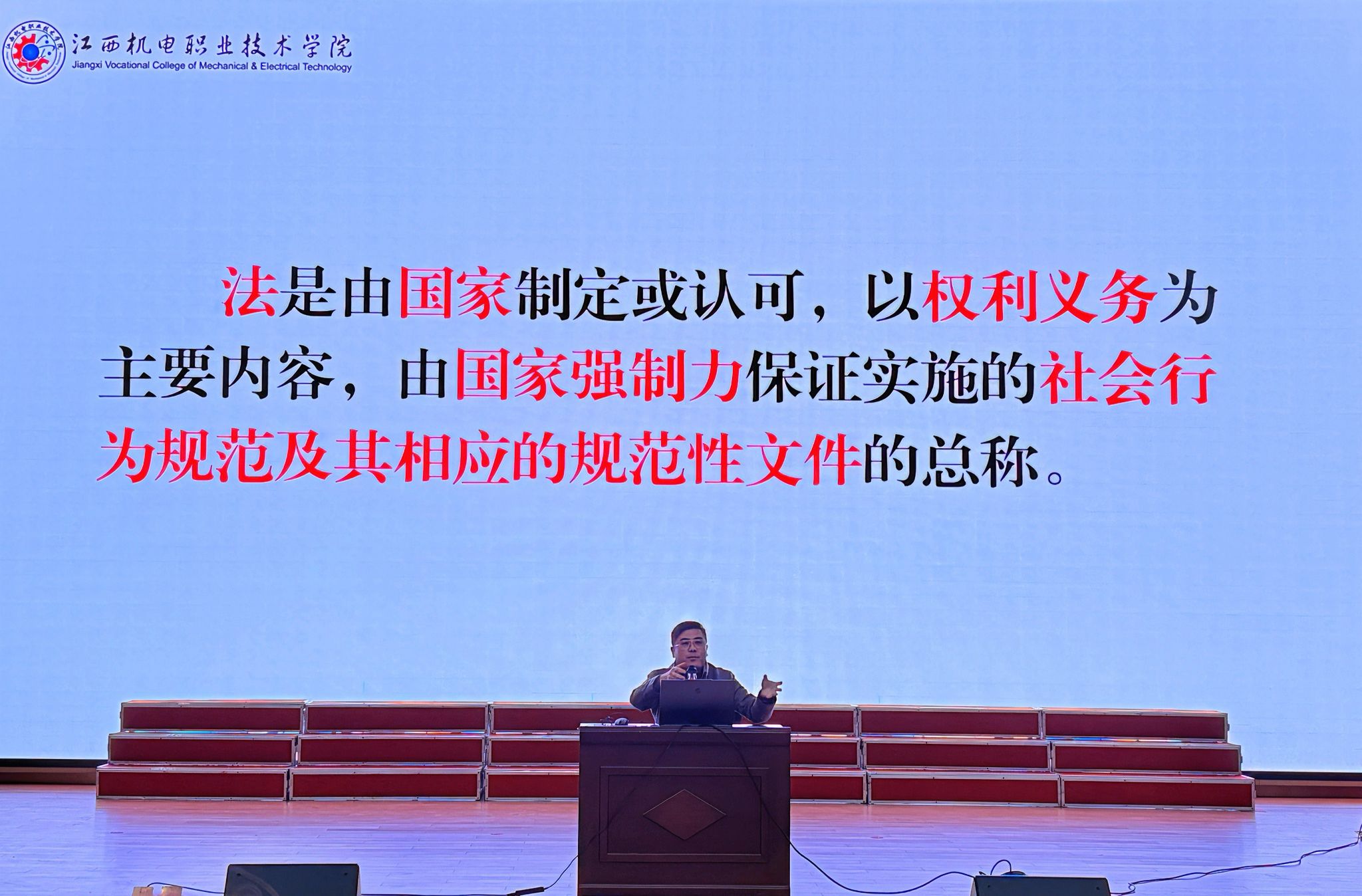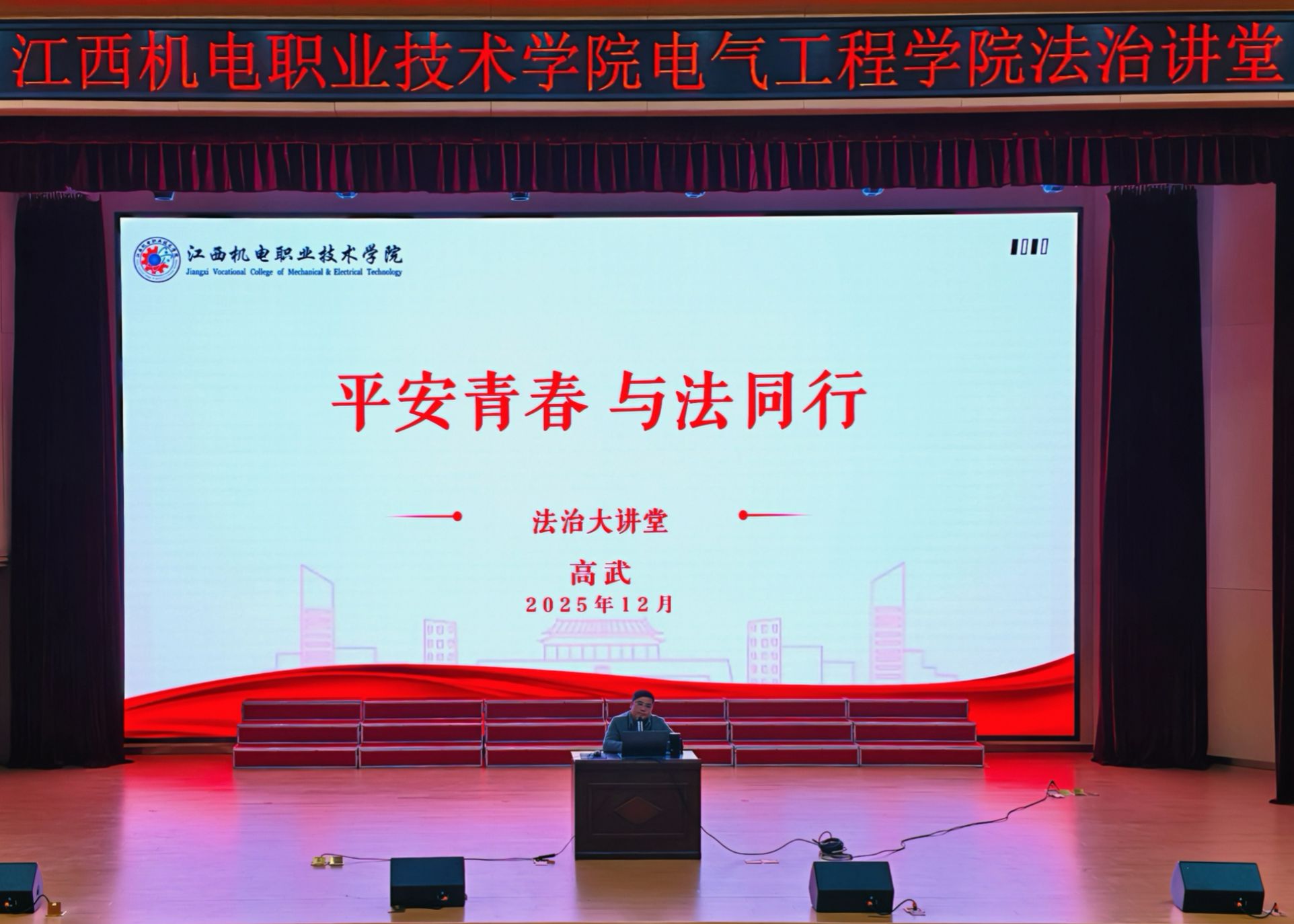 为进一步强化学生的法治观念与法律意识,筑牢校园法治安全防线,2025年12月,江西机电职业技术学院电气工程学院开展了以“平安青春,与法同行”为主题的“法治大课堂”活动。学院党总支书记高武担任主讲人,采用4天8场次覆盖全院的形式,为学院2584名在校同学带来了一堂堂生动且深刻的法治教育课。